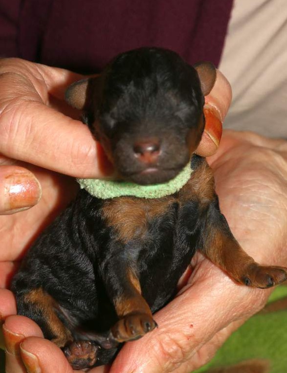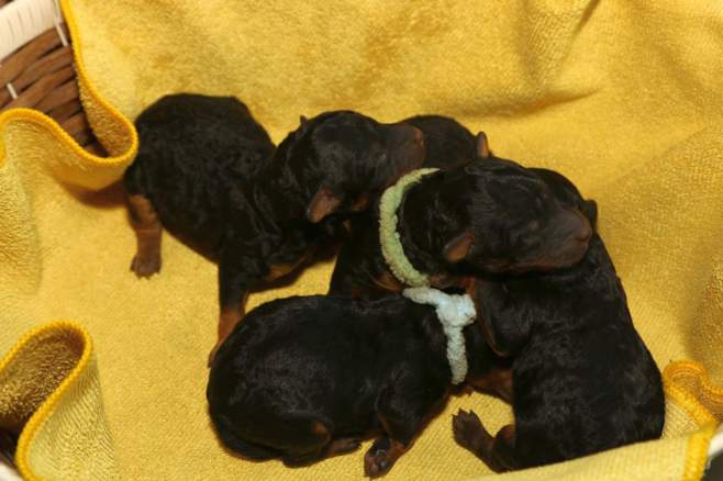 Unsere kleinen Räuber und Räubertöchter sind da! Am 60. Tag wollten die kleinen Banditen dann doch das Licht der Welt erblicken. Wie beim 1. Wurf sind es wieder 4 Welpen geworden, mit ebenso stattlichen Gewichten um 200 g. Dieses Mal sind aber alle schwarz/loh und zu meiner großen Freude sind 2 Mädchen dabei, eins bleibt voraussichtlich dann bei uns. Ich bin schon sehr gespannt, wie sie sich entwickeln. Was mich als blata Züchterin sehr freut, ist die korrekte und intensive Zeichnung aller Kleinen, zumindest sieht es zurzeit so aus! Es ist ein größen- und farbmäßig sehr ausgeglichener Wurf.Troll und Cara, das habt ihr ganz toll gemacht.